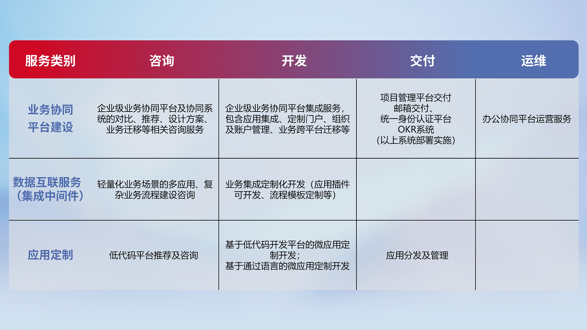 针对钉钉、、企微、、、、IDaas等平台级产品提供产品的规划、、、、方案、、、交付、、定制化开发等服务,,,实现如统一协同办公、、、智能客户服务、、混合会议管理、、、、智能数据查询、、、、等业务场景,,实现数字化转型。。。