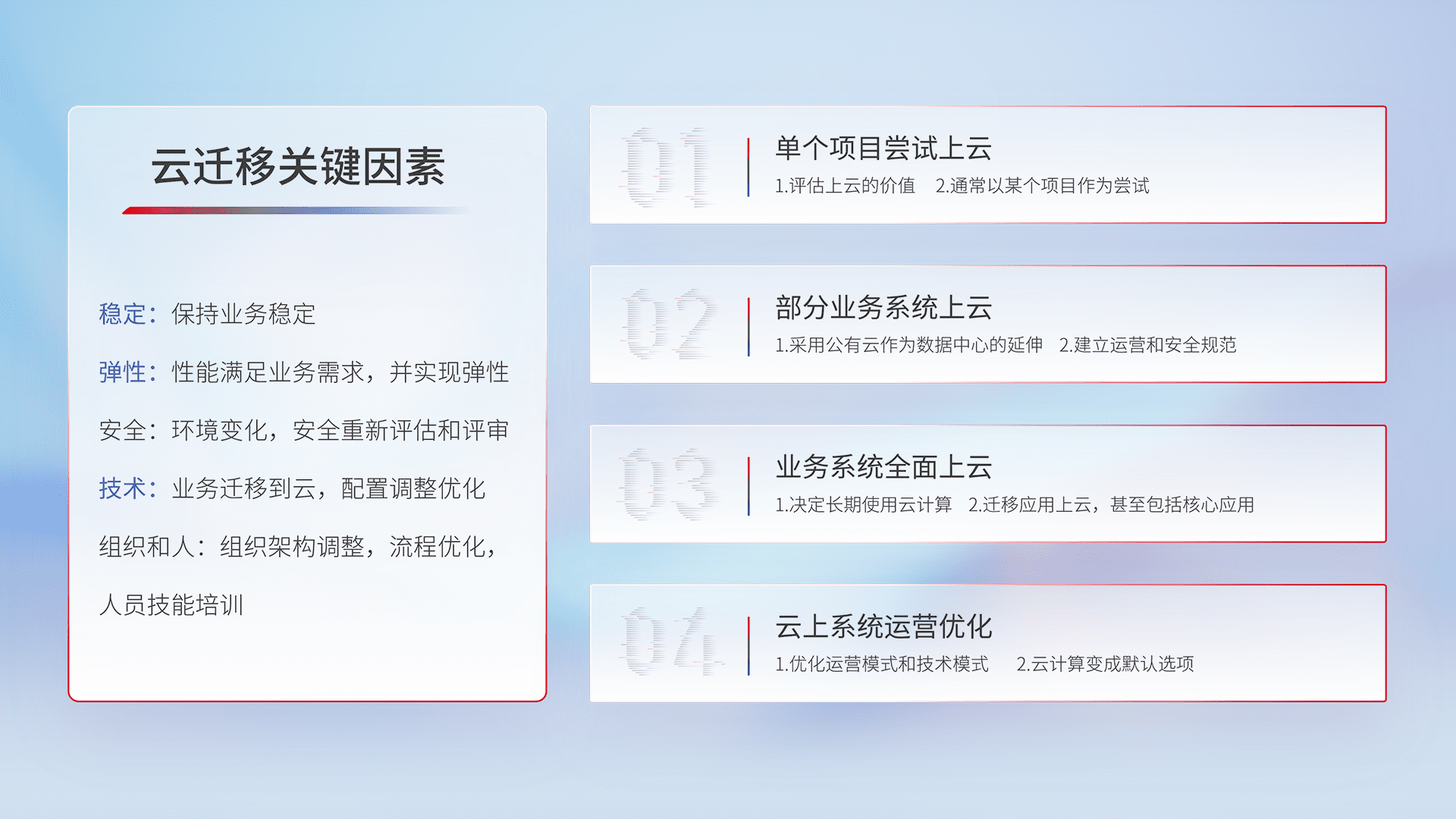 结合实际业务,,从规划设计、、、、云平台选型、、云原生改造、、、、数据迁移、、、集成交付,,,,迁移全过程为客户识别最佳上云路径,,,,做好风险识别管理,,设计网络架构、、、身份权限、、、安全审计合规、、操作审计、、、日志审计、、、、监控告警策略、、多站点容灾设计等,,,,对云上基础设施进行整体规划,,,,提升IT治理水平,,,以满足弹性、、高可用、、、高性能的需求。。。。
