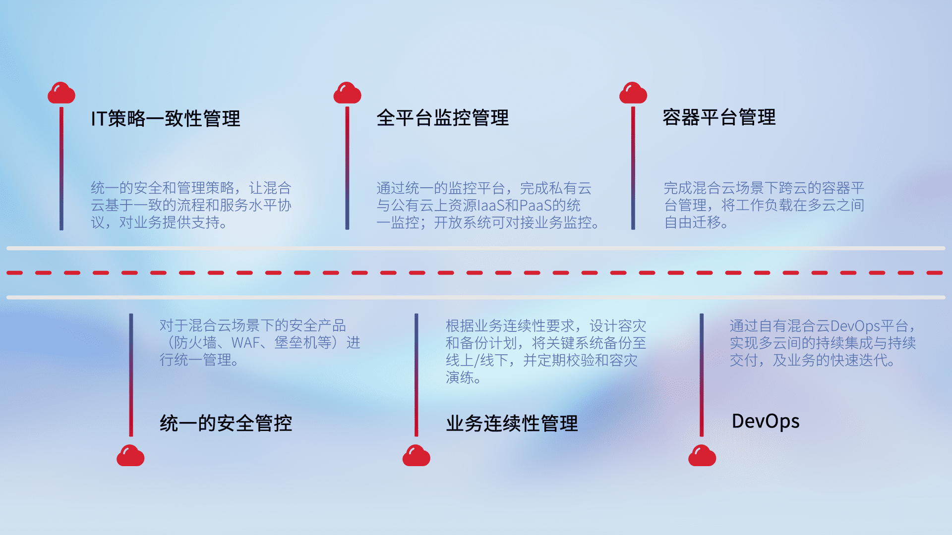 通过多云纳管,,,,以统一的资源数据模型把客户的云资源进行抽象和封装,,,进而实现对多云资源的统一操作,,,保障云资源管理的可靠性、、稳定性与可用性。。。。量身定制化运维内容,,配置、、、开发运维、、、补丁管理、、、备份、、监控、、、、认证和访问管理、、、审计和日常巡检等,,保障在用云过程中的可靠度,,,稳定度以及高可用率。。。。